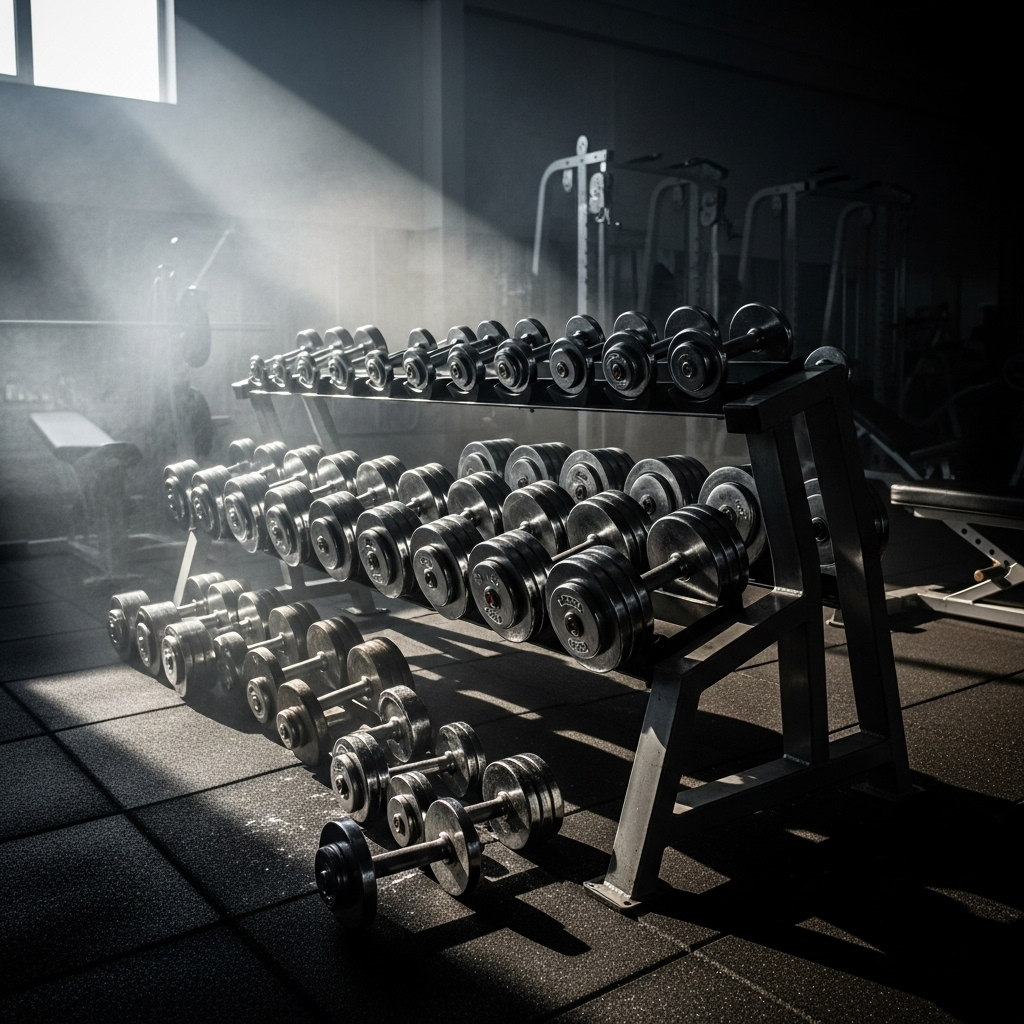 Dumbbells, barbells, and plates for strength and progression.